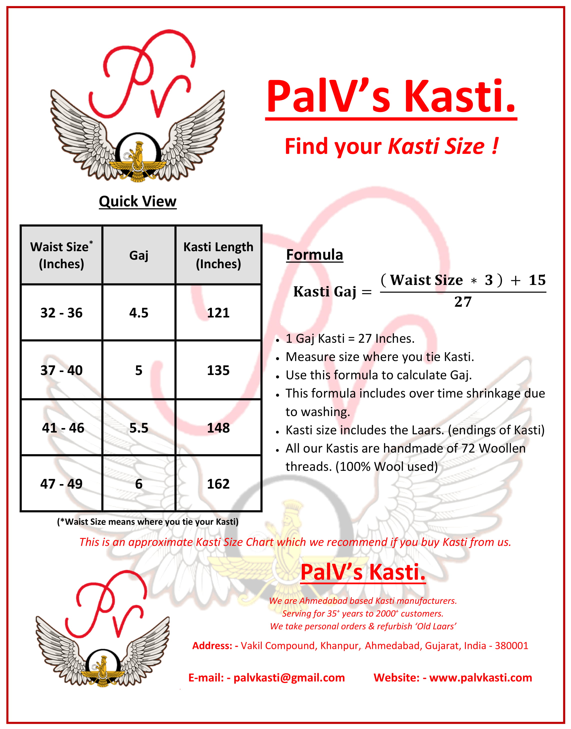 Parsi Kasti Size Chart
